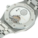 The bracelet is crafted from stainless steel in the classic Royal Oak design. seamlessly integrating into the case with a folding clasp for a secure fit. Functions include hours. minutes. and a power reserve of approximately 70 hours. ensuring reliable performance.