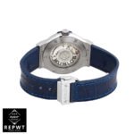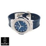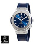 The Hublot Classic Fusion Automatic Blue Sunray Dial Titanium 565.NX.7170.LR Replica is a luxury watch. It features a 904L stainless steel case and bezel. with a sapphire crystal and a steel folding clasp. The movement is an automatic HUB1110 caliber with a 60-hour power reserve and a precision of -3/+3 seconds per day within COSC certification limits. The dial is blue with stick indices and hands. and the bracelet is made of crocodile skin with adjustable links.