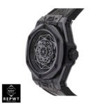 The dial is skeleton black with no numbers or hands. It has the functions of hours. minutes. seconds. and date. The watch has passed the 30m water resistance test and is protected by a full 2 year international United Luxury warranty. It is a perfect 1:1 super clone Swiss mechanism watch. with the same arrangeable serial numbers and cards. font. punto. and finishing for writings and markings. thickness. and size. It is indistinguishable from the authentic watch.