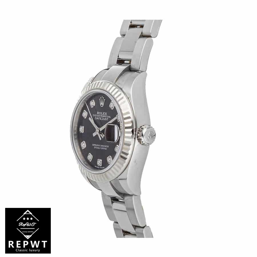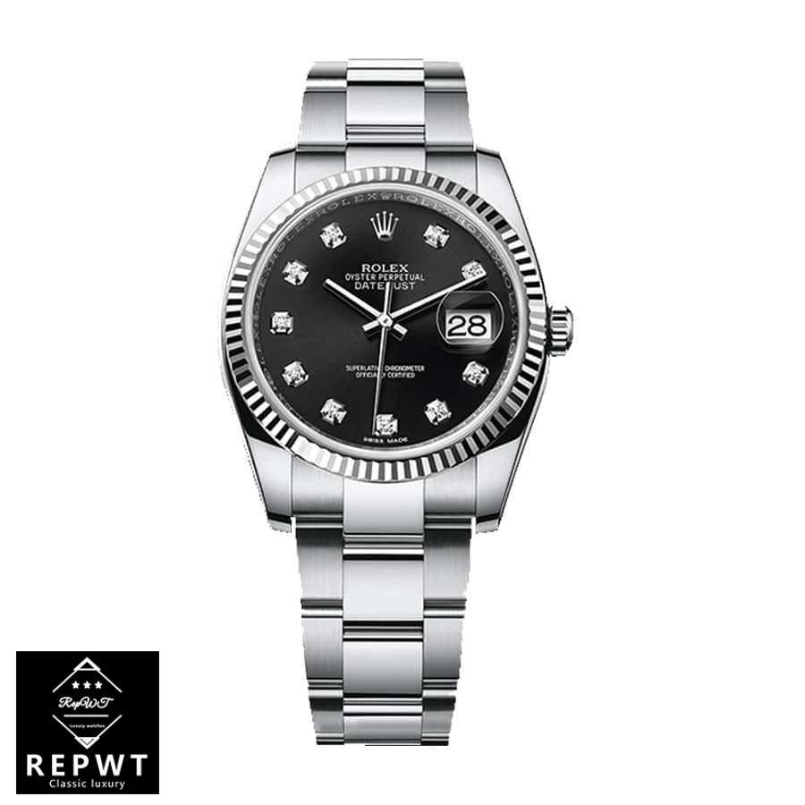 This Rolex Datejust 126334 replica watch is a stunning piece of craftsmanship. It features a 904L stainless steel case and bezel. with a black dial and gem-set indices. The movement is an automatic caliber 3235 with a 60-hour power reserve and precision of -3/+3 seconds per day within COSC certification limits. The second hand has a sweep motion. The bracelet is an adjustable 904L stainless steel Oyster with a fold clasp.