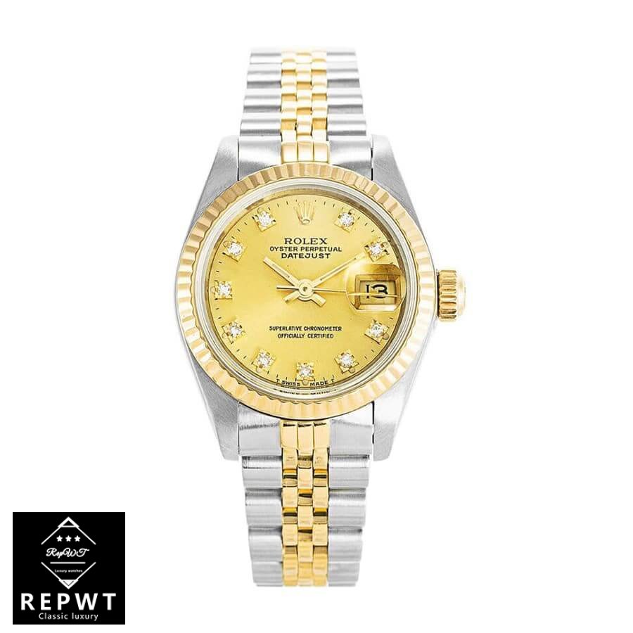 Immerse yourself in the world of untarnished elegance and matchless precision with the Rolex Datejust Yellow Gold Steel Diamond Dial Ladies 69173 Jubilee Replica. It promises to be not just a watch. but a statement of enduring luxury and uncompromised quality. Your wrist deserves nothing less.